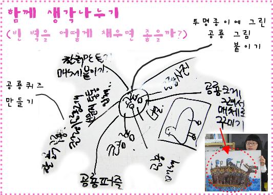 아이들과 함께 그린 그림에 대해 이야기를 나누던 중 쌓기영역 위의 빈 벽을 발견하고 이 공간을 어떻게 변신시키면 좋을까에 대한 고민을 나누어 보았답니다.