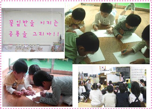 유아2:쌓기영역에서 놀이하는 친구들 다 다치면 어떻게 할래!! 유아3: 공룡 퀴즈를 적어서 붙여요. 그러면 꽃잎반에 들어오는 사람들이 공룡문제를 풀면 되잖아요. 유아4: 우리가 그린 공룡그림을 붙여요. 그러면 그 공룡들이 꽃잎반을 지켜주잖아요. 유아5: 꽃잎반을 지켜주는 공룡을 아주 크게 그려서 붙이면 더 멋지겠다.