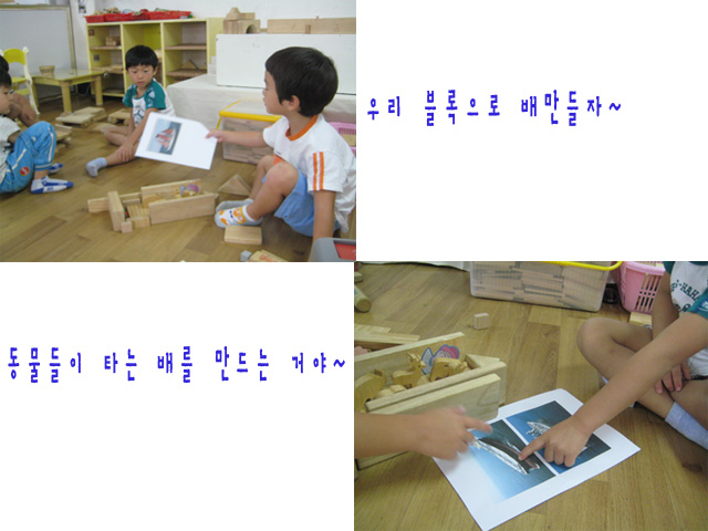 T: 그런데 왜 블록으로 배를 만들려는 거니? “매일 만들기만 해 봤잖아요. 그래서 오늘은 블록으로 해 볼래요” “우리 같이 배 만들자! 너희도 이거보고 만들래?” 옆에 있던 친구들에게 종이를 건네며 아이들은 블록으로 배를 만들기를 시작합니다.“나는 이거(배 사진1)보고 만들고 있다.” “우리는 이거(배 사진2)보고 만들고 있는데...” “여기 자동차 댈 수 있는데도 만들까?” “그래 주차장도 만들자!”