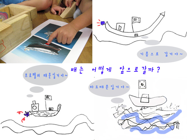 <물이 있어서 갈 수 있어. 잠수함에 있는 프로펠러 같은 것 때문에 가는 거야. 선풍기가 있어서 가. 전기, 불, 파도 때문에 가. 바람이 불어서갈 수 있어.> 배가 움직이는 원리에 대해 아이들은 나름대로의 가설을 주장하며 이야기 나눕니다.