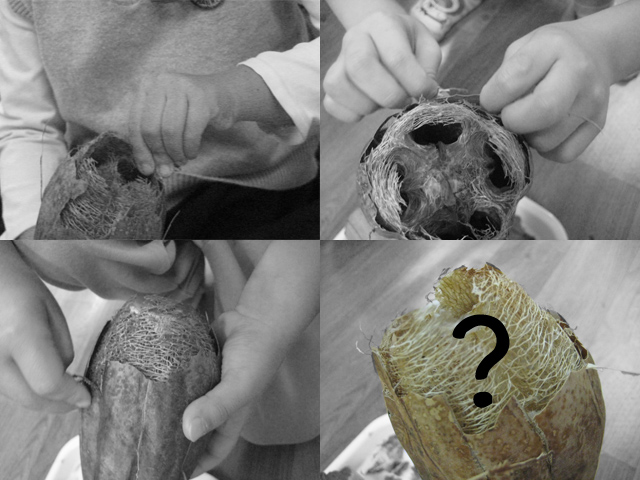 “수세미는 엄마가 말씀해 주셨는데 옛날 사람들이 그릇을 씻을 때 사용하는 거라 말씀하셨어요.” “수세미가 마르면 갈색으로 되는데 갈색으로 되면 수세미처럼 쓸 수 있다고 했어요.” “먹을 수도 있다고 말씀하셨어요.” “그런데 껍질을 벗기고 안에 있는 걸로 씻어야 해요.” “그러면 껍질 벗겨보자.”