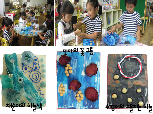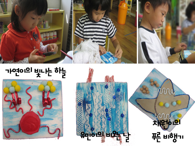 비록 <하늘반>이 우리가 만든 이름은 아니지만 우리가 숨쉬고 함께하는 이 공간의 의미를 만들어 가는 것은 하늘반 친구들과 교사 그리고 가족들이 할 수 있는 것이라 생각됩니다. 하늘반 친구들과 함께 내가 생각하는 <하늘> 그리고 그 속에서 내가 떠올린 것을 표현하며 의미 찾기를 하고자 작은 프로젝트를 계획해봅니다. 이번 주 부터는 친구들이 말하는 <나의 하늘>과 그것을 어떤 매체로 풀어내는지 그 이야기를 나누고자 합니다. 채준: 하늘... 하늘색이 생각나요. 온통 하늘색이잖아요. 하늘은 하늘색이 잘 나타내 줘요. 채준이는 하늘반에 있는 하늘색을 찾기 시작하고, 그것을 화지 위에 올려보며 이야기를 만들어 갑니다.민아: 하늘에 있는 구름...하늘을 향기나는 꽃과 동글동글한 콩으로 하면 잘 나타낼 수 있어요. 민아는 고민하더니 꽃잎과 콩을 가져와서 푸른 하늘 위에 올려봅니다. 수경: 하늘은 항상 하늘색만 있는게 아니예요. 해가 질 때 그때는 다른 색이죠. 이건 노을이 있는 하늘이예요. 수경이는푸른 하늘이 아닌 붉은 하늘을 우리에게 보여줍니다. 가연: 하늘에는 구름도 있고 해도 있어요. 해가 뜨거운건 철사가 잘 나타내 주는 것 같아요. 해의 이글거림을 철사의 굴곡으로 나타냅니다.유민: 비오는 하늘이 좋아요. 난 하늘하면 비오는게 생각나요. 유민이는 비를 표현할 수 있는 매체로 레이스와 철사를 선택했어요. 채원: 비행기는 하늘을 날아서 멀리 높이 날 수 있잖아요. 채원이는 비행기로 채원이의 하늘을 표현해 봅니다.