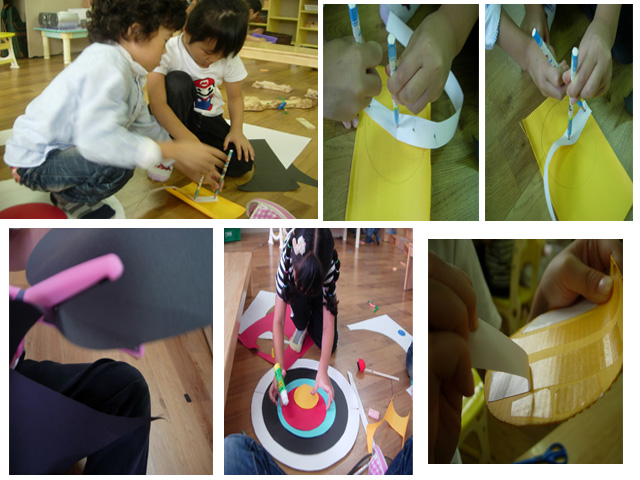 다음은 어떤 친구의 하늘이 소개 될까요?<화살놀이>하늘반의 종이 컴퍼스 만드는 방법을 알려 드릴께요.동그라미의 1/2길이로 종이를 자릅니다.그리고 원의 중심에 구멍을 살짝 내고 연필로 중심을 잡아요. 종이의 반대쪽에도 구멍을 살짝 내서 연필심을 살짝 끼워 넣습니다. 중심을 잘 잡은 다음에 연필을 돌려서 동그라미를 그려요. 이때, 종이가 찢어지지 않도록 힘을 조절해서 그리는 것이 중요해요. 원하는 크기로 그려진 동그라미를 잘라 냅니다. 간단하죠?^^ 종이와 종이를 조금 더 단단하게 고정하기 위해 양면 테이프로 붙여 줍니다. 점점 과녁의 모습을 닮아가고 있어요. 과녁에 색깔별로 점수를 매겨보고 싶어서 화살이 과녁판에 붙어 있기를 바랬어요. 과녁판에 광고물에서 떼어온 자석을 화살에 붙여볼까 생각도 해보았지만, 꼭 붙어있을 만큼 힘이 없었어요. 그렇게 고민하던 중에 까슬이와 보슬이를 사용하기로 했지요.