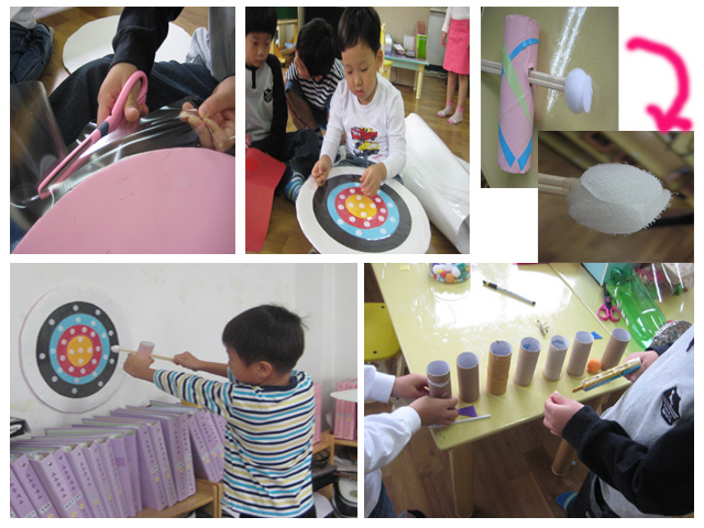 슈웅~ 화살 발사! 그런데, 화살이 붙여 있지 않아요. 화녁판을 맞추는 것보다 보슬이가 있는 부분에 꼭 맞추는 것을 더욱 힘든일이었죠. 아이들은 화살촉에 사방에 모두 까슬이를 붙였어요. <유아1: 내 화살에는 까슬이를 다 붙였으니 이젠 떨어지지 않을꺼야> 그리고 또 화살을 슈~ 웅 날렸어요. 화살이 과녁판에 붙었을까요? 아니예요~ 여전히 화살촉은 잘 붙지 않았어요. 내가 쏜 화살이 과녁판에 붙어 있기를 바라는 마음에 나의 마음과 과녁판에 거리는 점점 가까워졌어요. 그러는 사이에 다른 방법으로 화살놀이를 하는 아이들도 생겼어요. 마치 볼링을 하듯 휴지심을 세워놓고 넘어뜨리기 게임을 해요. 교실에서도 화살쏘기를 하고픈 하늘반친구들의 관심은 어떤 방향으로 나아갈까요?^^