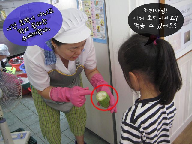 “근데 안에 하얀색 털 같은 것은 뭐지?” “안이 정말 하얘서 호박 같아!” “이건 호박이 아닐까?” “아니야! 오이야!” “왜?” “오이처럼 (세로)줄이 쭉~쭉~ 있잖아!” “근데 오이는 많이 뾰족뾰족하기도 한데 이건 아니잖아!” “그래도 먹는 것일 수도 있잖아.”“그럼 음... 아빠한테 가서 물어볼까?” “아빠한테 가져가면 잃어버릴 수도 있잖아.” “아~ 그러면 조리사님한테 물어보자!” “그래 조리사님은 음식을 해주는 사람이니깐 알 수 있을지도 모르잖아!”