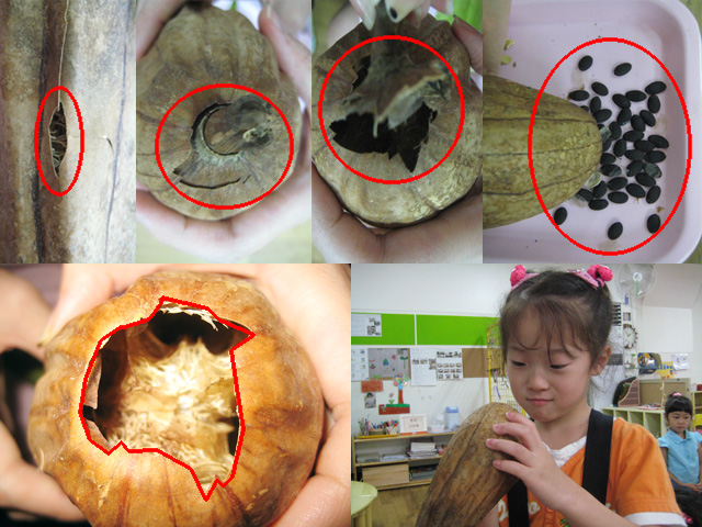 “근데 색깔이 왜 그래?” <현우: 이거 말려서 그래!> “우리 교실꺼랑 너무 다른데 수세미 맞아?” <수세미 맞아! 엄마랑 나랑 따서 말려 놓은거야!> “말리면 색깔이 저렇게 돼?” “우리 교실 꺼는 안 그렇잖아!” “아니다 잘 봐라~ 우리 교실 것도 썩고 있다!” “아니 썩는게 아니고 마르는거잖아!”수세미에 대한 의견이 분분한 가운데 수세미 위에 작게 구멍난 틈을 통해 아이들은 속을 들여다봅니다.