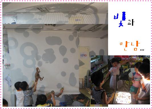 유아1: 와~ 커졌어요. 유아2: 으하하하하 저것 봐라!! 얘들아~ 내 손 좀봐! 거인 같지? 유아3: 진짜 크다~ 유아4: 나는 무시무시한 티라노다!! 다 잡아 먹어야지!! - 작은 물건도 빛을 통하면 커지는 빛.. 그리고 빛의 매력에 아이들은 흥미와 관심을 가지며 빛과의 흥미로운 만남을 기대해봅니다.