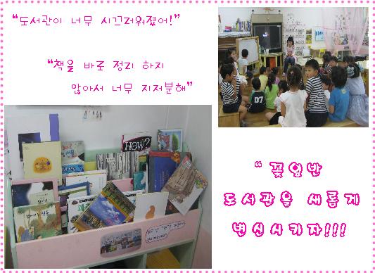 -시끄러운 시간으로 변해버린 독서시간에 대해 아이들과 함께 이야기를 나누어 새로운 도서관과서의 독서시간의 규칙을 만들어 보기로 하였답니다. 꽃잎반 도서관의 변신! 기대해 주세요!