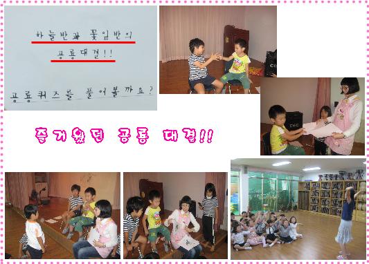 5분으로 제한된 시간안에 친구가 설명한 공룡을 많이 맞추는 공룡대결에서 꽃잎반이 7문제를 맞춰서 승리를 하였답니다. 형님들의 축하와 친구들의 축하를 받으며 뿌듯해 하는 아이들!! 승패를 떠나 서로의 관심을 나눌 수 있었던 시간이 더 큰 의미로 기억되길 소망하며 또 다른 공룡대결을 기대해봅니다.