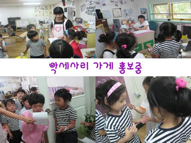 교사: 이거 얼마에요? 가게 주인: 천원입니다. 교사: 다 천원이예요? 손님: 네. 교사: 이렇게 작은 귀걸이랑 목걸이랑 가격이 같단 말이에요? 그럼 귀걸이가 너무 비싼 것 아닌가? 손님: 아.. 그럼 그건 백원이에요. 교사: 다른 사람도 가격을 알 수 있으려면 표시가 필요할 것 같은데? 교사의 말에 유아들은 곰곰히 생각하더니 철사로 줄을 쳐서 구분을 짓고 가격표를 붙입니다. "이제 됐다." 잎새반 유아들은 가게를 잘 운영하기 위해 필요한 것들을 고민하면서 하나, 둘씩 채워 나가게 됩니다."다른반 친구들에게도 잎새반의 악세사리가게를 알리고 싶어요!" "시장놀이할 때 처럼 전단지를 돌리면 좋겠어요."