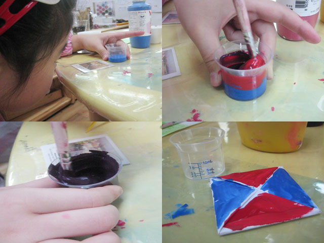 점점 더 많은 사람들이 찾게 되면서 악세사리가게는 하나의 놀이영역이 아닌 더 넓은 관계를 형성 할 수 있는 장소로 변해갑니다. 지금도 악세사리가게 친구들은 가게를 잘 운영하기 위해 필요한 것들에 대해 고민하고 채워가는 중이랍니다. 악세사리 가게에서 또 어떤 이야기가 펼쳐질지 기대해 주세요~!지난시간 유아들이 정한 방법인 <똑같은 뚜껑에 물감을 넣어 색 섞기>를 실험해보았지만 유아들은 만족스런 결과를 얻지 못했습니다. 놀이시간 유아들은 같은 양의 물감을 섞기 위해 다양한 방법을 찾아봅니다. 교사: 잎새반에 있는 매체물 중에서 똑같은 양만큼 섞을 수 있는 또 다른 매체물은 없는 걸까? 유아1: (눈금이 그려진 투명컵) 이거면 될 거 같아요. 유아2: 그것도 뚜껑처럼 물감이 잘 안 나오면 어떡해? 교사: 그럼 이 뚜껑 하나에 2가지 물감을 다 넣는 방법은 어때? 얼마큼 넣으면 똑같이 담을 수 있을까? 유아3: 여기 <눈금>이 10까지 있으니깐 5만큼 담고 또 5만큼 담아요. 유아들은 파란색 물감과 빨간색 물감을 눈금을 보며 담은 후 섞어보기로 합니다. 유아4: 와~보라색이 됐어요. 더 정확한 결과를 알아보기 위해 유아들은 흰색 종이를 사용하여 팽이를 만든 후 2칸씩 색칠하고 팽이를 돌려봅니다.