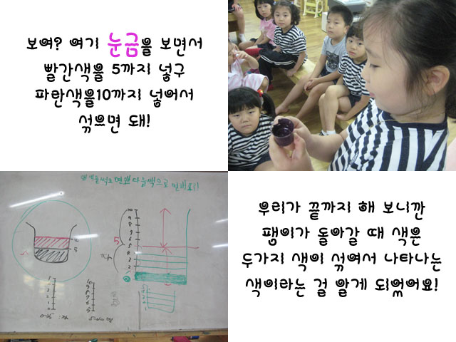 유아5: 어! 똑같아요. 우리가 섞은 물감색이랑 팽이가 돌아갈 때 색이 똑같아요. 놀이시간에 했던 경험을 공유시간을 통해 잎새반 친구들과 나누어 봅니다. 유아5: 여기에 눈금이 있는데 파란색을 5까지 넣고 빨간색은 10까지 넣었어. 유아6: 양이 다른 것 아니야? 유아7: 똑같지. 5+5=10 이잖아. 유아8: 5까지 물감을 담고 또 10까지 담으면 10까지 담은게 더 많을 것 같은데. 유아들의 이해를 돕기위해 그림을 통해 한칸 한칸 수를 세며 궁금증을 풀어 나갑니다. 유아들은 궁금증을 풀어나가는 과정에서 수를 세는 경험을 뛰어 넘어<부피>라는 수학적 개념까지 경험하게 되는 기회를 갖습니다. 지속적인 탐구를 통해 잎새반 유아들은 <팽이가 돌아갈 때 나타나는 색이 섞인 색>이라는 결론을 스스로 도출해 내는 값진 경험을 할 수 있었답니다.