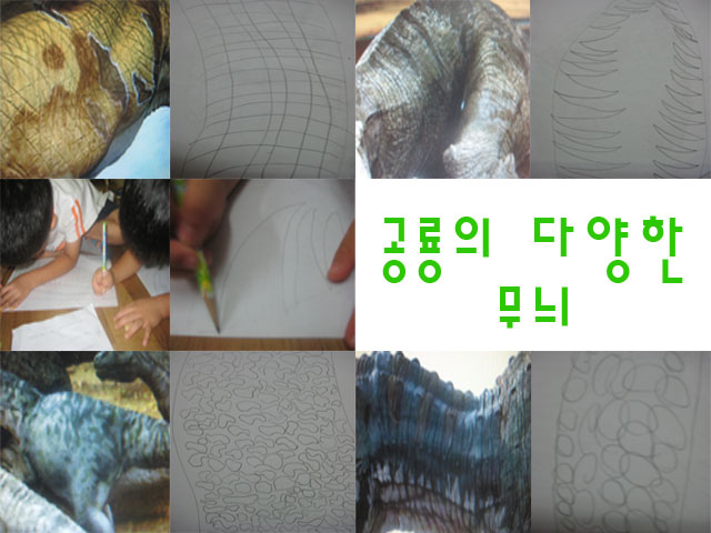 무늬에 관심이 있는 친구들은 공룡의 다양한 무늬를 책에서 보는 것에 그치지 않고, 종이에 연필로 그려봅니다. 또 찰흙 위에 여러 가지 도구, 재료, 방법을 이용해 무늬를 나타냅니다. 그러면서 공룡의 각각 다른 무늬를 알아가는데요.