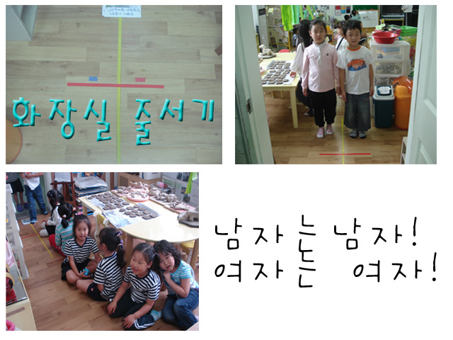 어느 날 한 친구에 의해 화장실 줄서기 규칙이 생깁니다. 유아: 여기 테이프 없어졌어요. T: 그러네? 선생님이 붙여줄게. 테이프를 붙은 후 유아: 2줄로 서도 되겠어요! 남자랑 여자랑이요! T: 그렇네? 꼭 한 줄로 서야된다는 법은 없으니까. 남자친구들이 남자변기에 가까운 쪽으로 서는게 좋을 것 같은데? 유아: 그것도 괜찮은 것 같아요. 그 때부터 남자친구는 왼쪽, 여자친구는 오른쪽에 서게 됩니다. 유아1: 남자, 여자를 표시해야겠어요! 파란색 테이프에는 남자라고 쓰고 빨간색 테이프에는 여자라고 쓴 뒤 해당하는 줄에 붙입니다. 유아1: 잘 안보이네? 나중에 잘 모를 때 바꿀께요. 그리고 자연스레 또 다른 규칙이 생기는데 남자친구가 벗은 슬리퍼는 다음 남자친구가