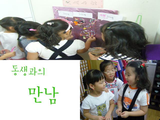 악세사리 가게 유아들은 자신들이 가르쳐준 방법대로 귀걸이와 목걸이를 완성해 가는 동생들을 보며 뿌듯함을 느낍니다.