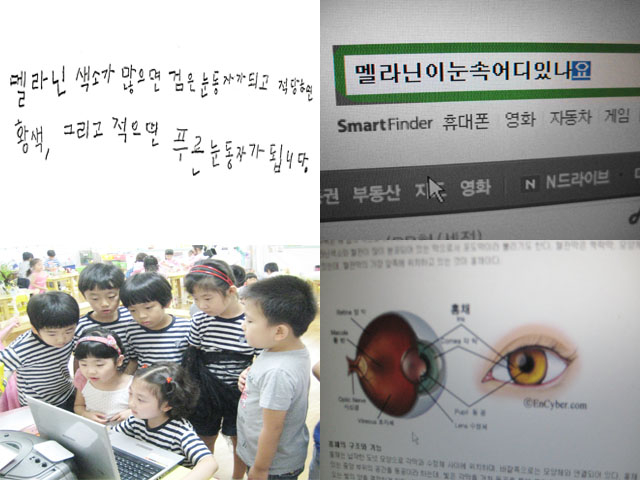 독서시간~ 유아들은 <꼬마외계인의 인체 여행>에 나오는 <파란 눈>에 호기심을 가집니다. 유아1: 신기해요! 우리 눈동자는 진한 갈색인데 여기 그림 속 눈동자는 파랑색이예요. 유아2: 고양이에서 진화된 사람인가? 유아3: 내가 TV에서 본 적 있는데 외국인 눈은 파란색이었어. 유아4: 나라마다 눈 색깔이 다른 건가? 유아5: 다른 사람 눈동자 색 한번 보고 싶어요. 유아들은 인터넷을 통해 다양한 나라의 눈동자 색을 탐색해 봅니다. 유아4: 으악! 빨간 눈이다. 귀신같아요. 유아5: 한림유치원에 있는 토끼눈도 빨간색인데... 유아6: 사람과 동물들 마다 눈동자 색이 다른 이유는 뭘까? 검색창에서 찾아보자! <눈동자 색이 다른 이유는?> 검색결과... <멜라닌 색소가 많으면 검은 눈동자가 되고, 적당하면 황색, 그리고 적으면 푸른 눈동자가 됩니다>라고 적힌 답변을 발견합니다.