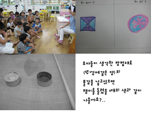 교사: 보라색과 하늘색으로 접은 팽이가 돌아가면 어떤 색이 나올까요? 유아1: 그냥 하늘색만 보일 것 같은데요? 유아2: 팽이를 접을 때 진한색이 연한색을 잡아먹어서 진한색이 보일 것 같아요.