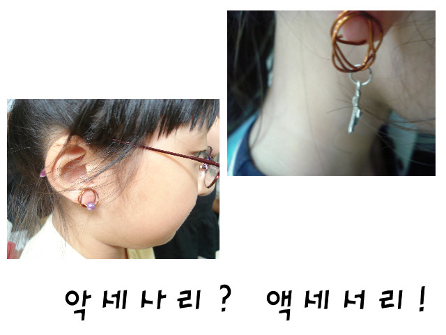 악세사리를 만드는 놀이에 빠져있던 어느 날 T: 악세사리가 뭐길래 계속 악세사리라고 하는거니? 유아: 여자들이요, 머리에 방울 같은거 꼽는거요. 팔찌도 만들 수 있고, 목걸이도 만들 수 있어요. 유아1: 악세사리는 만드는게 아니고 팔고 있는 거예요. 유아2: 그러면 만들어서 팔면 되잖아요. 유아3: 그런데 팔기 위해서는 만드는 것도 필요해요. T: 그러면 악세사리는 무엇일지 인터넷에서 찾아보자. 여기에는 ‘액세서리’의 잘못 이라고 되어있는데? 유아3: 아! 알겠다. 말이 어려워서 바뀐거예요. 유아: 악세사리에 왜 잘못이 들어가요? T: 액세서리가 원래 맞는 말인데 사람들이 악세사리라고 부르다보니까 바뀌었을 거예요. 그런데 그 말이 맞을 수도 있겠네. 액세서리에 대한 이야기를 계속 이어나가기로 합니다.
