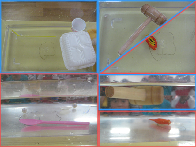 “음~~ 너무 작은 것은 물에 가라앉나?” “맞아. 플라스틱이 너무 얇아서 물에 가라앉는 거 아닐까?”