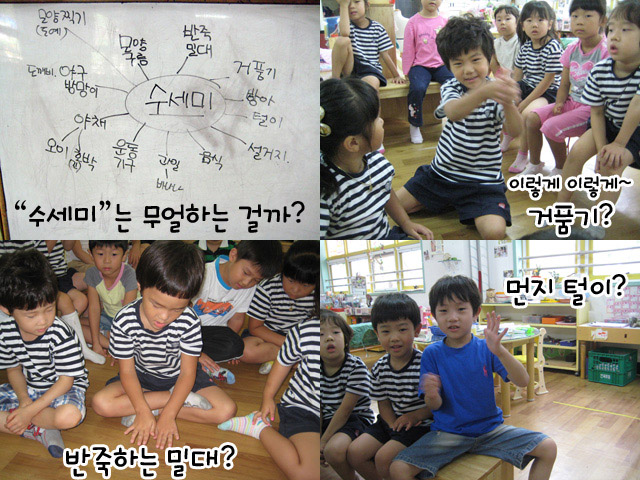 "오돌도돌해요." "무거워요." "수세미가 푹 들어가요." “간지러요.” “몰랑몰랑해요.” “미끄러워요.” "딱딱해요." “딱딱하다고? 그런데 어떻게 안으로 들어가는데?” “그건.. 여기는 좀 말랑해서 들어가고, 여기는딱딱해서 그렇다.” “무겁고 말랑말랑하고 딱딱해요.” “그건 좀 말이 안 돼는 것 같다.” “그래! 딱딱하면 딱딱하지 딱딱하고 말랑말랑한 건 말이 안 되는거 같아.” “아니~ 내 말은! 조금 말랑하고 많이는 딱딱하단 말이야!” “오돌도돌, 뾰족뾰족” “보들해요.” “뽀송뽀송한 것 같아요.” “공기가 들어있는 것 같아요.” “여기서 물 같은게 나와요.”