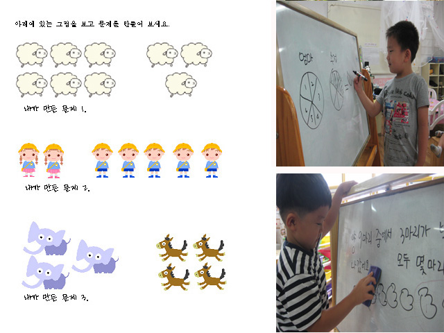 1번 문제: 1)양 6마리가 놀고 있는데 친구 3마리가 더 왔어요. 양은 모두 몇 마리 일까요? 2),9마리 양이 있어요. 그런데 친구가 양 세마리를 사 갔어요(질문이 없네요) 3) 양치기 소년이 양 6마리를 갖고 있었다. 그런데 다른 농장에서 양이 뛰어왔다. 모두 몇 마리?(더해진 양의 숫자가 없죠?) 4) 양 6마리가 있었는데 3마리가 놀러갔어요. 더하면 모두 얼마일까요?(무엇이 이상할까요?)2번부터는 점점 어려워하네요~ 무엇이 문제인지 잘 살펴 보세요.