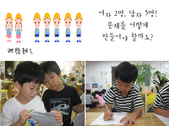 수학은 우리 삶 곳곳에서 만날 수 있는 친숙한 분야입니다. 나이, 주소, 전화번호, 생년월일, 유치원 가는 시간, 우리 가족 수, 내가 좋아하는 동물 순서 등 많은 것들 속에서 수학은 녹아 있답니다. 유아들이 집에서 가져오는 학습지를 보면 교사들은 깜짝 놀랍니다. 온통 숫자와 기호로 덮여있고 그림 몇 가지를 상황적 맥락없이 문제 풀이와 정답 맞추기에만 집중하고 있는 모습을 보면 걱정부터 앞선답니다. 하지만 유아들에게 정말 중요한 것은 <수학적 사고능력>을 갖는 것입니다.삶 속에서 수학적 상황을 파악하고 이해할 수 있으며 논리적으로 사고할 수 있는 능력을 갖는 것입니다. 그리고 언어로 적힌 것을 숫자로, 그림으로 또 숫자나 그림을 언어로 표현할 수 있는 <수학적 표상언어>도 중요하답니다. 그래서 7세반에서는<수학적 사고능력>을 알아보고 지원해주기 위한 첫 단계로 <재미있는 수학놀이>활동을 시작해 보았답니다.