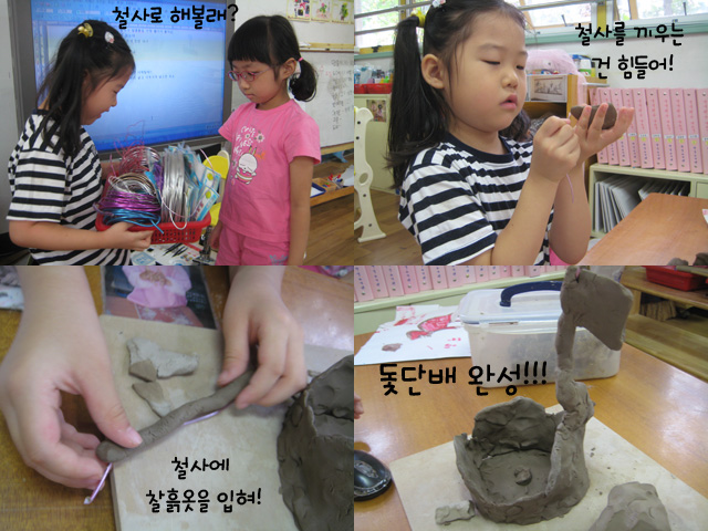 “새싹반에 있는 찰흙 풀로 붙여.” “그냥 돛을 색종이로 하면 안돼?” “안돼! 나는 찰흙으로 만들고 싶거든.” “거기에 뾰족한 막대기나, 이쑤시개 같은 거넣어서 만들면?” “그래~맞네! 철사 같은 거 넣으면 되겠네~.” “그럼 철사를 끼워야 되는데... 어느 정도 굵기면 될까?” “너무 얇으면 돛이 부러지니까, 조금 더 두꺼운 것이 좋겠는데~.”