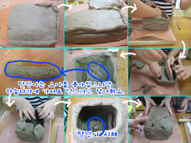아이들은 도예시간에 배웠던 기법을 사용해 찰흙을 코일링해 나갑니다. “밀어라 밀어~” “밀대로 조금 밀어서 밑판을 만들고...” “이렇게 뱀처럼 길게해서 둥글게 쌓아 올리는 거야!!!” “우와~점점 높아지고 있어.” “그런데 지붕은 어떻게 하지?” “지붕은 세모 모양으로 만들어서 위에 덮으면 되잖아.”
