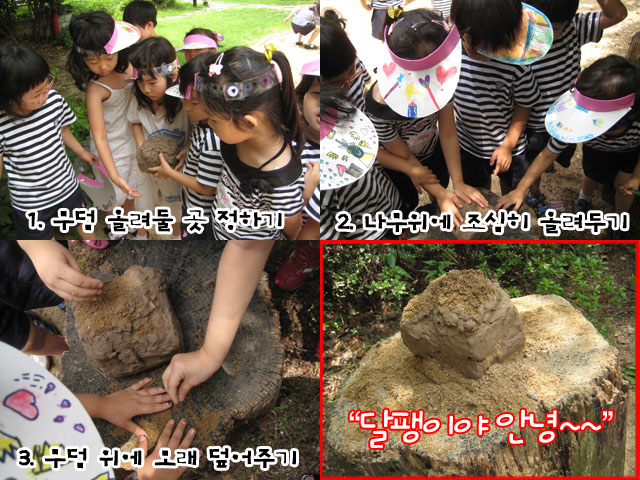 아이들이 만든 달팽이 무덤은 과연 어떤 모습으로 완성 될까요? 여러 가지 문제점이 생길 때 마다 아이들은 각자 자신이 알고 있는 의견을 제시하고 다른 사람의 의견을 수용함으로써 문제점들을 원만히 해결해나가며 함께 공동 작업을 이룰 수 있었습니다.<달팽이 무덤 만들기>