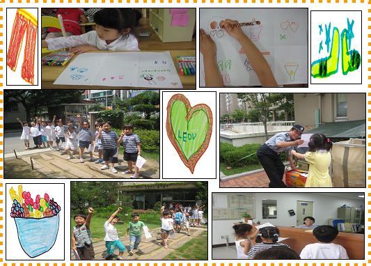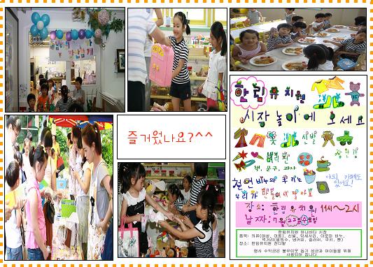 3층 과학관으로 이동하여 문을 열었습니다. 조용~한 분위기에 열심히 공부하는 사람들을 보며 발 뒤꿈치를 들고 조심조심 책을 찾아봅니다. 이리저리 숨죽이며 열심히 찾은 결과~ 개구리에 관한 전문 서적을 찾았답니다. 소리는 지르지 못하고 너무나 기뻐하는 우리 친구들~ 주말과 방학 때 친구들과 도서관으로 자료번호로 책찾기 게임을 한번 해 보세요~ 좋은 경험이 될 거예요.<함께하는 시장놀이> 한림의 가족과 지역주민들과 함께 아나바다시장을 열어보았습니다. 다들 즐거우셨나요? 이번 시장놀이에서 하늘반 친구들에게 맡겨진 임무가 있었어요. 바로 ~<전단지 만들기와 아나바다 시장 알리기> 그래서 시장놀이에서 판매하게 될 물건들을 정하고 눈에 잘 띄일 수 있도록 그림으로 그려보았지요.그렇게 정성드려 쓴 글과 그림을 선생님께서 다시 포토샵 작업으로 전단지를 완성하여 주셨답니다. 우리는 완성한 전단지를 가지고 아나바다시장을 알리기 위해 유치원을 나섰습니다. 주변 동네를 돌면서 만나는 아주머니께 인사도 드리고 시장소개도 해 보았어요. 평소 부끄러움을 많이 타는 친구들도 이번 기회로 다른 사람들 앞에서 나서서 이야기를 해보는 경험을 가져보았습니다. 아이들이 직접 글과 그림으로 전단지를 완성하고 발품을 팔아 아나바다 시장을 알리며 그 날을 준비하고 있었어요.