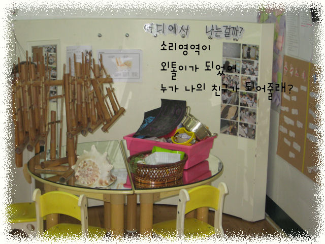 여러 가지 소리들을 들을 수 있고 멋진 소리를 가진 악기를 만들 수 있던 소리영역이 영역활동시간이 되어도 친구들이 찾아오지 않았어요.