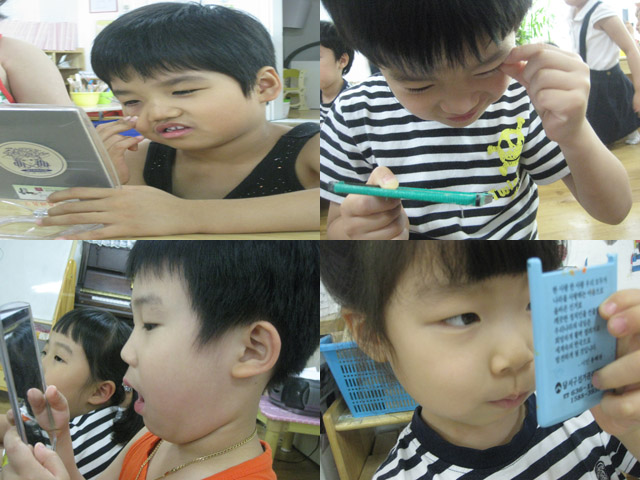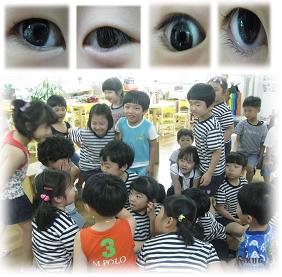 유아6: 검은 눈동자도 두개 있어요. 가장 안에 있는 눈동자는 검정색이고 그 밖에 있는 눈동자는 조금 갈색이예요. 유아7: 안에 눈동자만 있으면 되는데 밖에 눈동자까지 있어야 하는 이유가 뭐지? 유아8: 까만 눈동자가 앞을 잘 볼 수 있게 해주고 검은 눈동자를 보호하기 위해서 갈색 눈동자가 있는 것 같아. 유아9: 가장 작은 눈동자만 있으면 앞을 조금만 볼 수 있고 갈색 눈동자가 있으면 더 멀리 볼 수 있지 않을까? 유아10: 손이나 발에도 점이 있듯이 우리 눈에도 점이 있는게 아닐까요? 유아11: 사람들 몸에 있는 점의 위치는 다 다른데 왜 눈에만 똑같은 위치에 점이 있어? 유아12: 사람들한테 반드시 있어야 하는 것이기 때문에 똑같이 있을 것 같아.유아13: 나는 갈색 눈동자로 앞을 볼 수 있는 것 같아. 왜냐하면 갈색 눈동자에 거울을 보는 내 모습이 그대로 비췄거든.