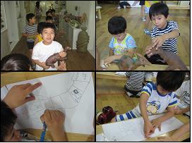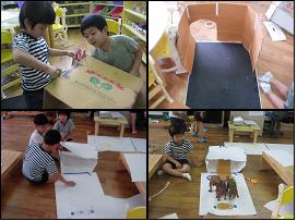 이때부터 유아들은 공룡게임에 필요한 기지를 만들기 시작합니다. 공룡놀이에는 공룡들이 쉴 수 있는 호텔, 먹이를 먹는 레스토랑, 약속을 어겼을 때 벌칙을 받는 경찰서등등.. 오른쪽 그림 속에 만들기에 열중인 아이들의 모습이 보이시나요?