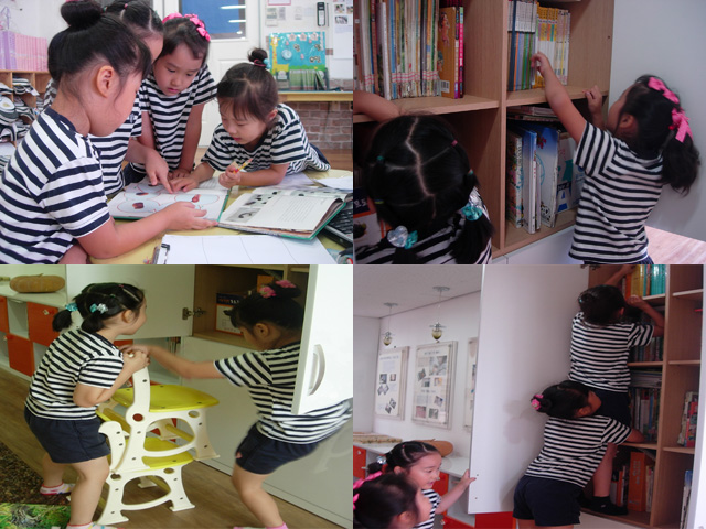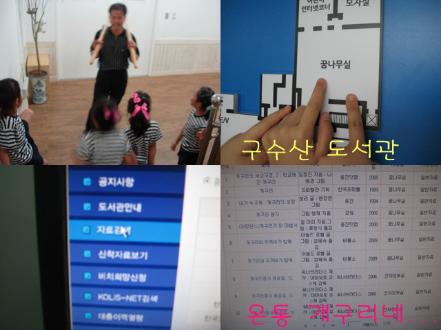 동생반, 친구반을 다니며 개구리 책을 모아보고, 유치원 책장에 있는 개구리 책도 모두 찾아봅니다. 유아들: 여기있는 것도 다 시시한 것 뿐이예요. 우리는 더 멋진 자료가 필요해요. 유아4: 맞다! 구수산 도서관에 가면 책 많은데!