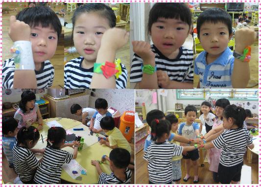 미니카 선수 중 한 친구가 색종이를 말아서 팔찌를 만들어 그 위에 색종이로 접은 미니카를 붙여서 친구들에게 보여주자 다른 친구들도 미니카 팔찌를 만들기 시작했다.