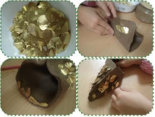 한국자원공사를 간 이슬반. 먼저 지렁이가 우리에게 얼마나 이로운 동물인지를 잘 설명해 주는 비디오를 시청했어요. 지렁이는 음식물 쓰레기를 먹고 깨끗하고 좋은 흙인 분변토를 주어 나무나 식물이 잘 자랄 수 있도록 도와준대요. 그리고 또 한 가지. 쓰레기 분리수거를 할 때는 꼭 삼각형을 확인하고 철, 플라스틱, 유리, 알루미늄 등으로 분리를 해야 재활용하여 사용할 수가 있어요. 캔 5개로는 우리가 3시간동안 텔레비전을 볼 수 있는 전기를 만들고, 우유팩 30개로는 두루마리 휴지 5개를 만들 수가 있으며, PET병은 재활용하여 옷을 만들며, 알루미늄은 자동차 부품으로 이용 할 수 있대요. 교실로 돌아온 이슬반 친구들은 우유 통에서 삼각형을 찾기 시작했답니다.# 찰흙, 금색 종이가 만나면...
