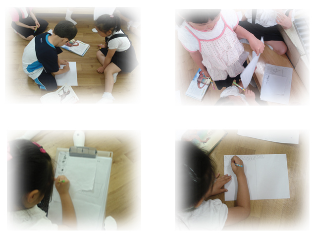 공룡 그리기를 하는 친구들은 자기역할에 맞게 정한 일들을 해봅니다. 3명의 감독 중 1번 감독은 티라노 그리기 역할을 새로 정하고, 2번 감독은 그만 두려고 하는 친구를 설득해 다시 놀이를 할 수 있도록 하고, 3번 감독은 사진기를 들고 다 그린 그림을 찍어 기록으로 남깁니다. T: 왜 사진찍기를 한다고 한거니? 유아: 공유시간에 볼 수 있어서요! 그리기를 하는 친구들은 3명의 감독들에게 확인을 받고 수정해가며 티라노 그림을 그립니다. 놀이를 하며 또 다른 문제가 생기지는 않을까요?