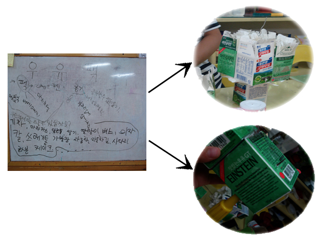 많이 모으기는 했지만 조금 밖에 사용하지 않아 점점 더 늘어만 가는 것에 대해 이야기를 나누어 봅니다. T: 우유팩이 모이고 있는데 너희들이 사용하지를 않으니 점점 더 늘어가고 있어. 이 많은 우유팩들을 어떻게 사용하면 좋을까? C: 놀이시간에 조형영역에서 만들기하면되요. T: 어떤 것을 만들 수 있을까? 아이들은 기차, 마라카스, 딸랑이, 담는통, 버스, 의자, 칼, 쓰레기통, 케이크, 화분 등 많은 것들을 만들 수 있다고 말합니다. 이야기 나누기가 끝나고 놀이시간에 조형영역으로 간 친구들은 우유팩으로 자동차와 크리스마스 트리를 만들고 우유팩을 쌓아 케이크를 만듭니다. 이슬반 친구들은 우유팩으로 계속해서 다양한 것들을 만들어 나갑니다.