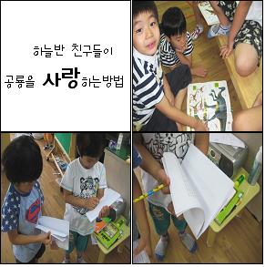 이토록 열망하는 공룡책! 하늘반 친구들은 요즘 공룡들에게 마음을 쏙~ 빼앗겨버렸어요. 그래서 놀이시간에도 공룡그림을 그리려는 아이들로 공룡책 주변은 와글바글 하지요. A4용지를 여러 장 겹쳐 접고 사이를 테이프로 고정한 것을 공룡책이라 부르고, 그 속에 사랑하는 공룡을 그려 넣어요. 그림에 자신이 없는 친구는 잘 그리는 친구들에게 그림 그리기를 부탁하기도 하고, 그림을 잘 못 그리지만 정성을 들여 그리기를 시도하는 친구들도 있어요.선을 하나하나 곱게 접어서 완성한 공룡종이접기. 종이접기한 공룡을 공룡그림위에 붙이고는 공룡화보라고 적어 봅니다. 교사: 공룡화보? 화보가 무슨 뜻인지 아니? 유아: 잘 모르겠어요. 책에서 봤어요. 마냥 공룡이 좋은 하늘반 친구들은 공룡책의 표지를 보고 따라 해보기도 하지요. 또, 공룡그림과 함께 미션카드를 만들며 공룡게임을 고안하고 있는 친구도 있어요. <공룡>이라는 공통된 관심사가 있긴 하지만, 그 속에서 공룡을 사랑하는 방법으로 종이접기를 선택한 아이, 그림 그리기로 표현하는 아이, 게임을 고안하는 아이와 같이 다양한 방법으로 공룡을 표현해 냅니다. 하늘반 친구들은 이밖에도 어떻게 공룡을 사랑하는 마음을 표현해 낼까요? 개개인의 상상 속에서 자라고 있는 공룡들의 모습이 기대 됩니다.<지구를 지켜라>