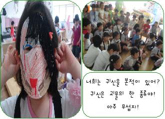 유아 : 야! 천만 쓰고 다니면 다 귀신이가? 별로 무섭지도 않다. 유아1: 가면 써 봐라. 무섭게. 교사 : 어떤 모습이 귀신 같은거지? 유아2: 귀신은 이상하게 생겼고 어두운 곳에서 나타나요. 유아3: 귀신이 입이 터져있어서 피가 나고 있어. 유아4: 얼굴이 동그랗고 표정이 무서웠어요. 유아5: 내가 본 귀신은 머리가 긴데 얼굴에 반은 머리카락으로 가리고 얼굴에 반만 보였어. 또 입에서 피가 흐르고, 하늘에서 나타났어. 아이들이 텔레비전에서 보거나 이야기 속에 있는 상상의 귀신의 모습은 비슷하면서도 다릅니다. 말로 표현하는 것으로 부족한 듯 그 모습을 가면으로 표현합니다.