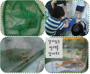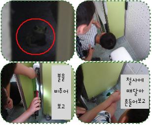 그리고 본격적으로 개구리를 꺼내기 위해 갖은 방법을 동원하는데요. 바로 그 때, <개구리는 움직이는 것이 먹이인 줄 알고 달려들잖아.> 그리고는 철사에 매체물을 달아 흔들흔들 흔들어줍니다. 그것을 본 개구리는 욕조 밖으로 나와 이슬반 친구들 곁으로 돌아오게 됩니다. 하지만 개구리를 찾은 친구들은 개구리가 사라졌을 때의 마음과 달리 <개구리를 이슬반에서 키우겠다.>고 합니다. 그리고는 밖으로 나가 살아있는 곤충, 벌레를 잡아옵니다. 잡을 때 제일 중요한 것은 <살아있어야 한다는 것>입니다.