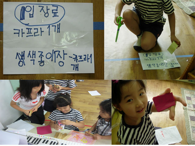 카프라가 부족하여 색종이 2장밖에 사용하지 못하는 친구는 잠시 고민하더니 활짝 웃으며 주인장에서 네모난 종이를 건냅니다.유아2: 여기 현대 카드요. 카드로 계산해 주세요.