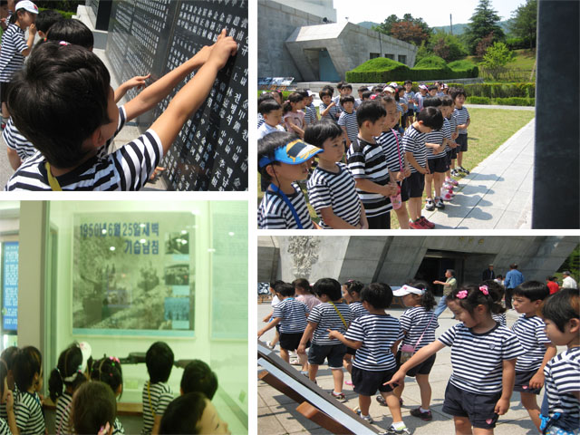 6. 25 기념일을 앞두고 가까운 <다부동 전적비>를 찾았습니다. 기념관에 도착하여 비석을 보면서 많은 사람들의 이름이 적혀있는 이유를 생각해 봅니다. 우리나라를 지키기 위해 돌아가신 분들을 생각하며 감사한 마음으로 잠시 묵념을 해 봅니다. 기념관에 마련된 6. 25 당시 사진전을 둘러보며 전쟁 당시의 여러 상황도 살펴봅니다. 전쟁상황에서도 공부하는 사진을 보며 : 전쟁났는데도 공부하네~ 신기하다~ 라고 말합니다.