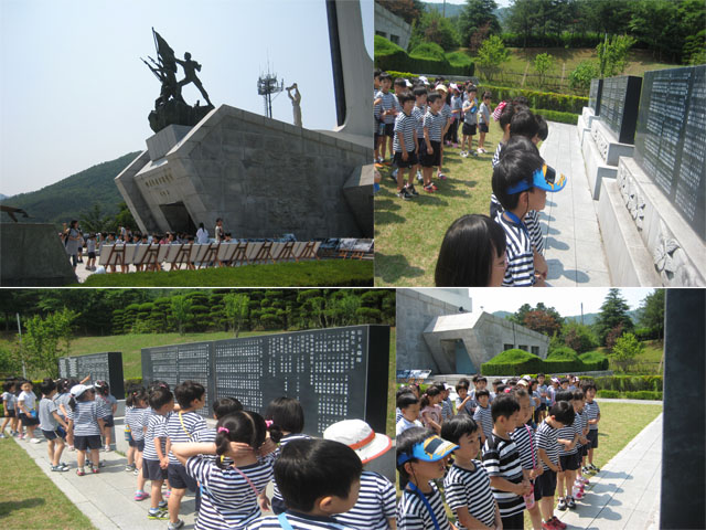 대화를 나누며 주변을 둘러보니 기념관 입구에 16개 외국 깃발이 보여요.나라를 지키기 위해 순국하신 분들을 위해 비석 앞에서 잠시 묵념을 합니다. 전시관 앞에 마련된 기념 사진전을 둘러보며 전쟁 당시의 상황을 살펴봐요. 전쟁을 하는 모습, 다친 사람들, 전투기, 공부하는 아이들, 피난가는 사람들... 직접 겪지는 않았지만 사진 자료를 통해 위급했던 그때를 느껴봅니다. 전시관 안으로 들어가니 남자친구들이 소리를 지르며 관심을 보이네요. 전쟁 당시 사용했던 무기들을 살펴보며 모델명, 원산지, 모델의 특징 등도 눈여겨 봅니다.