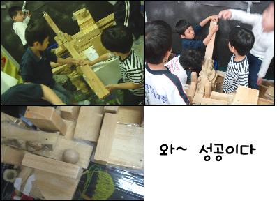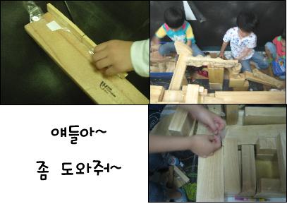 우주기지 팀은 아니지만 관심을 가지던 유아들도 놀이에 참여하게 되고 두 명의 유아가 검은 벽 쪽에 긴 나무 블록을 기울어지게 연결합니다.