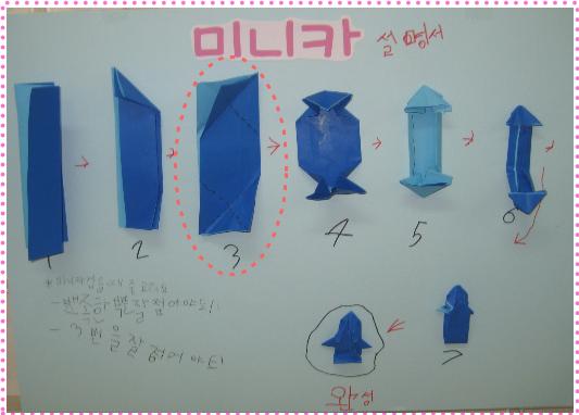 - 미니카 선수들은 미니카 접기를 못하는 친구들을 위해 하나하나 자세하게 미니카를 접어서 번호와 화살표로 설명서를 완성하였답니다.