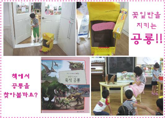 유아2: 도서영역에 두자!! 친구들 책 읽을 때 보게~ 유아: 아니~ 공룡 꽃잎반 문 앞에 두는게 더 좋을 것 같은데.. 꽃잎반 지켜주는 공룡하면 되잖아. 유아3: 우리가 집에 가고 없을 때 혹시 도둑이 들어올 수도 있잖아! 그러면 이 공룡이 선생님도 지켜주고 꽃잎반도 지켜주고.. 유아2: 그게 더 좋겠다! 그러면 우리 문 앞에 갖다 놓자! 유아: 공룡아~ 꽃잎반 잘 지켜줘! 알았지?