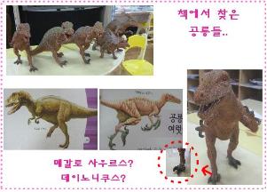 - 친구들이 가지고 온 공룡책을 보며 꽃잎반에 있는 공룡을 찾아보았답니다. 책을 통해 찾은 공룡은 파라사우롤로푸스! 스티라코사우르스! 디플로도쿠스! 티라노 사우르스! 그리고 이름이 헷갈리는 공룡도 발견.. 발톱을 보면 데이노니쿠스인데 몸집을 보니 메갈로사우르스 같기도 하고.. 아이들과 책과 인터넷 정보를 통해 알아보기로 하였답니다. 이 공룡의 이름은 둘 중 뭘까요?