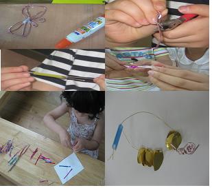 유아7: 예전에 빵끈 안으로 보니까 중간에 철심이 있었어요. 그래서 잘 구부러지나봐요. 유아8: 다른 철사 하나를 더 이용해 감아도 연결할 수 있어요.공유시간을 통해 다양한 방법들을 이야기 나눈 후 테이프가 아닌 다양한 매체로 철사를 연결하여 작품을 만들어 봅니다.