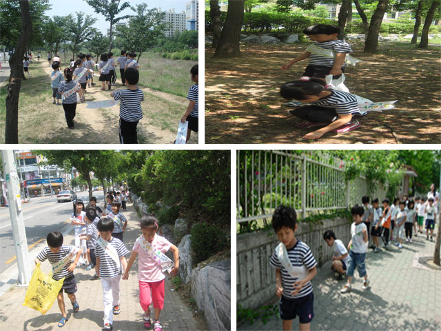 친구들의 생각을 담은 어깨띠를 만들어봅니다. <버리는데 1초, 살리는데 100년> <주우면 예쁜 손 버리면 못난이 손> <쓰레기는 쓰레기통에 집을 찾아주세요> <깨끗한 지구를 만들어 주세요>유치원 주변과 강변을 따라서 환경 캠페인을 떠납니다. 손수 만든 환경보호 어깨띠를 메고 쓰레기를 담을 봉투와 지구를 살릴 예쁜 마음을 갖고 출발합니다.